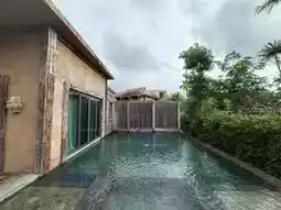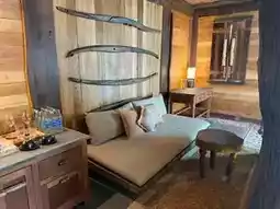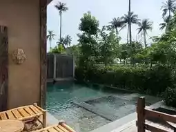 This time, we stayed in the Dinso Villa, a 220-square-meter room with the largest pool in the room. It was private and close to the sea. The room had a very spacious outdoor pool area with a bed and a work desk behind it. The room was decorated with wood, and the floor was noisy. Be careful, the wood is uneven. It's best to wear shoes when walking. The TV felt small compared to the room. There's also a sofa area for relaxing.