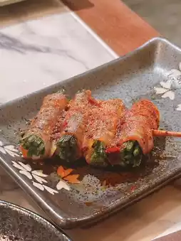 Sauced Grilled Chewy Rice Cake Roll🍡 A la carte $26💰Thinly sliced pork wrapped around rice cake😉 savory, sweet, and chewy👍🏻