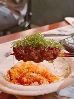 Wagyu Stick with Truffle Rice Bite🐄 A la carte $58💰Staff freshly shaves cheese🧀, then mix the cheese, truffle🖤, egg yolk🥚, and rice🍚 together yourself. One bite of scallion wagyu, one bite of mixed rice, absolutely amazing💯