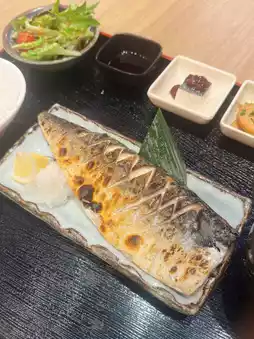 Salt-grilled mackerel set meal 🍱 Mackerel grilled until golden 😱 crispy outside and tender inside 😆 retained the juice ☺️ dipped in carrot puree sour sauce more appetizing 🥕 Comes with salad 🥗 appetizer 🧆 pickles, miso soup 🥣 pearl rice 🍚 dessert 🫘
