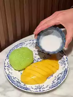 Soft and sweet green sticky rice with pandan aroma, served with half a fresh, juicy mango.