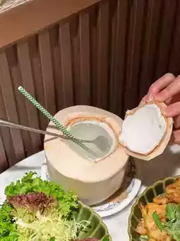A large coconut filled with refreshing coconut water and tender, easily-scraped coconut meat.