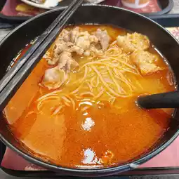 Chose tom yum soup base, pork neck, fatty beef, mackerel fish balls with rice noodles