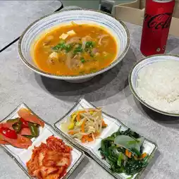 The doenjang soup has a rich flavor, with pork, tofu, and potatoes, served with steaming white rice, bringing a sense of warmth and happiness. The appetizers and kimchi pairing also enhance the flavor of this soup.