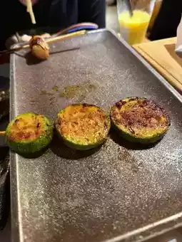 The tamagoyaki is caramelized, giving it a sweet and crispy texture. Inside, it’s filled with eel and cheese, making the flavor very rich!