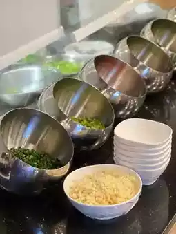 The signature spicy broth is topped with a layer of bright red oil, infused with chili and Sichuan peppercorns for a complex and layered flavor. The tomato broth is rich, sweet, and tangy, with a natural taste enhanced by ginger bits, balancing the greasiness of the ingredients and offering a refreshing and appetizing experience. The staff recommends tasting a bowl of the broth first, then using it to make dipping sauce, or you can create your own sauce at the self-service station.