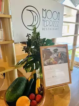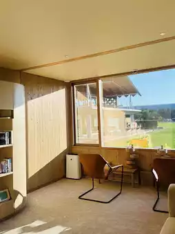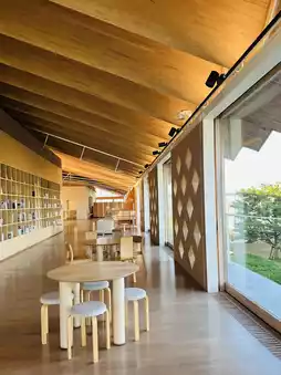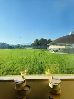 A bright library right at the front desk and several libraries overlooking the green rice paddies.