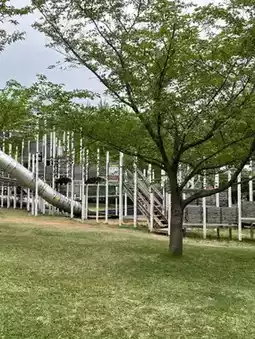 The giant playground equipment "Tsuru no Toride" appears to be modeled after the Tsuru no Mai Bridge.