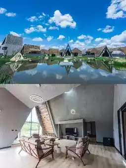 Nordic-style glass houses like Finland's, nestled at Changbai Mountain's base surrounded by forest. Spacious rooms with balconies offer mountain views from bed