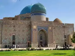 The complex is massive and beautifully preserved, with its turquoise-tiled dome dominating the skyline. Walking through its grand halls, intricate brickwork, and stunning mosaics, you can truly feel the power and ambition of the Timurid Empire. What makes the site even more special is the atmosphere—it remains a living place of pilgrimage, where people come not only to admire the architecture but also to honor Khoja Ahmed Yasawi, a revered Sufi poet and mystic whose teachings shaped the spiritual life of the region.