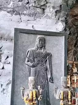 The highlight that makes Wat Khao Tham Thiam famous is the "Phra Phuttha Pusyakhiri Sri Suwannaphum" (Luang Pho U Thong), a Buddha image in the posture of prostrating to his mother. It's carved into the cliff face of Khao Tham Thiam (Flying Dragon Cliff). With its imposing size, it stands 108 meters tall and has a lap width of 65 meters, making it the largest Buddha image in Thailand. Some sources even say it's the largest in the world. Standing beneath this majestic Buddha image will inspire a sense of faith and awe.