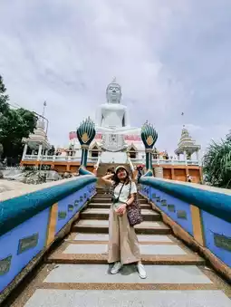 📍The highlight here is the large white Buddha statue, approximately 14 meters tall, or "Luang Pho Khao," enshrined on a pink lotus pedestal with the Ubon Ratchathani Dam as a backdrop. You have to climb over 1,049 Naga steps. It's not very steep, but it's quite tiring. You'll have to stop and rest when you're tired, and the heat makes it even more tiring. Upon reaching the top of the Buddha statue, we discovered... several cars parked at the top! Yes, there are two ways to get there: either by stairs or by car for those who don't want to walk or can't walk. 😅 The road is well-paved and accessible to all types of vehicles. I consoled myself that the walk up was more enjoyable, haha.