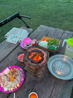 The highlight that makes Wang Kang Hung different from other tent sites is the grilled pork service at night from many shops located along the area, providing complete services, including charcoal stoves, marinated pork, dipping sauce, and fresh vegetables.