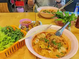 The menu offers a wide selection of noodles, rice dishes, and appetizers. The signature dishes are the fried and fresh meatballs and spring rolls. The Tom Yum noodles are incredibly spicy and generously portioned, served with vegetables at the table. The grilled Karen chili with shrimp paste is a must-try. The shop is located in the heart of the city, close to tourist attractions and the Candle Festival procession. Anyone visiting Ubon Ratchathani should definitely stop by and enjoy a meal.