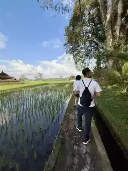Your walk will take you through emerald rice fields, where young shoots sway in the breeze and the mirror-like water reflects the pastel hues of sunrise. With every step, the peaceful countryside unfolds—simple village homes, farmers tending their fields, and the timeless rhythm of Balinese life. It’s a gentle reminder to slow down, breathe deeply, and let nature’s calm wash over you.