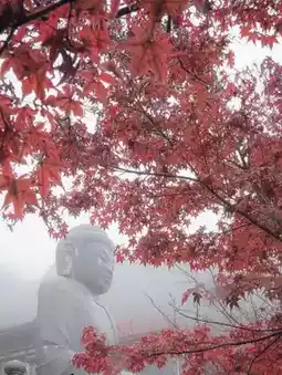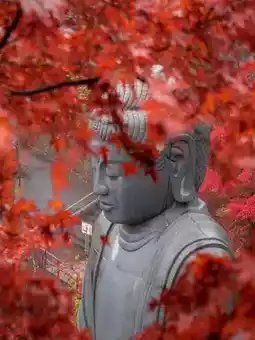 📸 A must-shoot! The giant Buddha statue surrounded by mountains of red leaves is a spectacular sight