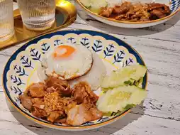 This shop is considered a secret shop in Udon Thani. It's located in an alley. Nook pinned it on Google Maps. The shop's decoration is so cute!!!🤍 When I got there, they served me desserts. I was so impressed.🥰 The food here is not expensive at all. It's delicious and you get a lot.🍛 If you're hungry, I recommend this shop.