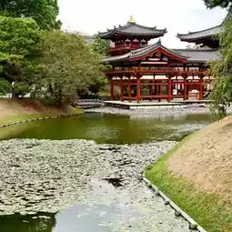 Uji Byodoin, built during the Heian period, is a UNESCO World Heritage site located peacefully by the Uji River 🌊, surrounded by a pond fed by the river’s water. The temple complex includes the Phoenix Hall 🦅, Hoshokan Museum 🏛️, and other buildings, with visitors typically entering through the “Main Gate” 🚪.