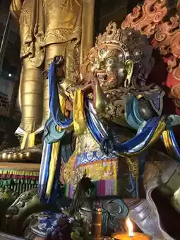 → The low voices of the monks and the sounds of Tibetan ritual implements echo, creating a sacred atmosphere.