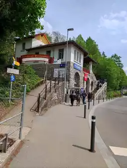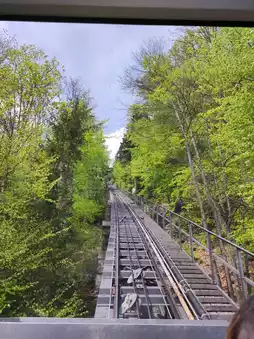 Starting near Interlaken Ost train station, the Harderbahn funicular climbs 1.4 km and over 700 m in elevation, through forest terrain, in just 8–10 minutes—with gradients reaching up to 64% at points.
