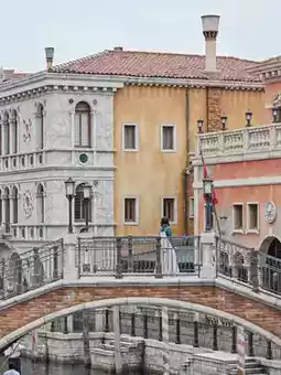 A photo of a subject standing on the bridge "Ponte dell'Artista," which connects to the restaurant "Ristorante di Canaletto," taken from the bridge "Ponte di Benvenuti" near the Venetian Gondolas.