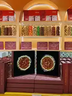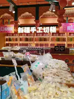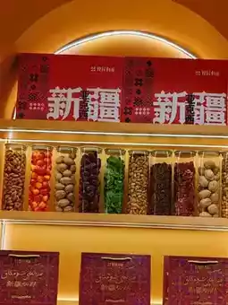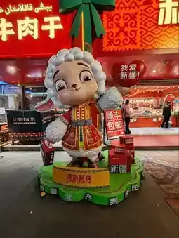 The shop named "Herdsman's Gift: Xinjiang Specialty Souvenirs" is filled with strong Xinjiang ethnic characteristics. A cute cartoon sheep at the entrance warmly welcomes guests, while the interior boasts vibrant and distinctive decor. Shelves are lined with a wide array of Xinjiang nuts, dried fruits, and the famous handmade nut cake, showcasing the region's abundant natural products. Whether as souvenirs or for personal enjoyment, this is the perfect place to discover delicious flavors full of local character.