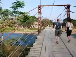 Atmosphere: An untrustworthy bridge with gaps between wooden planks… This bridge offers a beautiful view of the river and surrounding mountains in Vang Vieng, so don’t miss this during your stay!