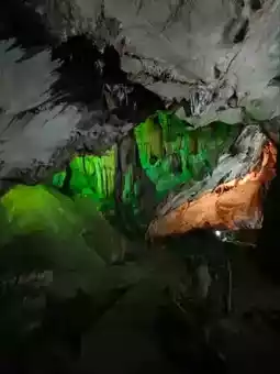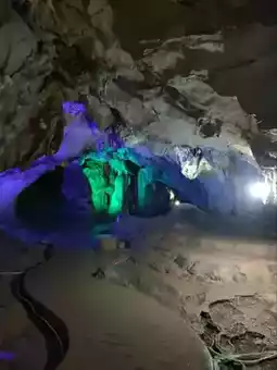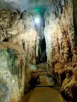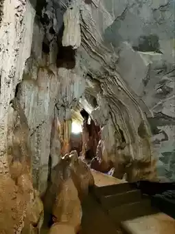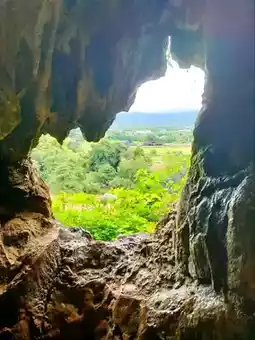 Inside, the cave is cool and quiet, with interesting rock formations and little chambers to wander through. There is a soft echo to every sound, which makes it feel mysterious. One of my favorite parts was stepping out to the viewpoint, where you can see the river winding through the valley and the limestone mountains stretching into the distance.