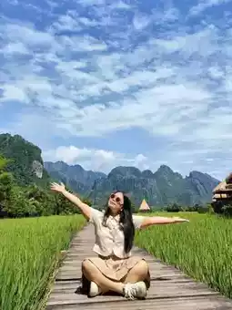 Coordinates for taking photos with the wooden bridge, rice fields, and Vang Vieng mountain range