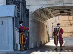 Soldiers in colorful striped uniforms are always seen standing guard at the right aisle entrance of St. Peter's Basilica in the Vatican. They are the Swiss Guard, the Pope's personal bodyguard and one of the world's oldest active military forces.