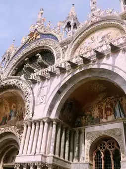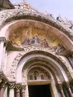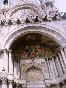 • Above the arch on the facade is a mosaic depicting the hiding of St. Mark's body and its transport to Venice (including the scene where he covered it with pork and vegetables to deceive the censors).