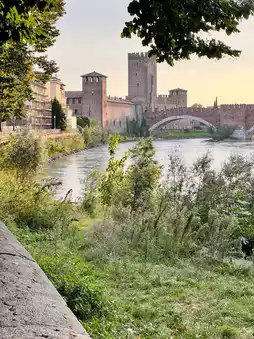 As the sun began to lower, we made our way to the Adige River, crossing the Ponte Pietra, Verona’s oldest bridge. The golden hour hit the water just right, casting a soft amber glow over the city. I walked along the riverbank, the sky melting into pinks and purples, bells chiming in the distance, and the breeze carrying the scent of blooming oleander.