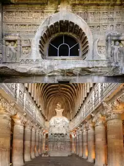 The Ellora Caves were built during the reign of the Chalukya and Rashtrakuta dynasties in India. During that time, Hinduism slowly revived, Buddhism declined, and the government promoted Jainism, resulting in the coexistence of the three religions. Ellora is located in the center of India, and people from the three major religions came one after another. The first to arrive were the Buddhists, who came in 600 AD. The Ellora Mountains are steep, so they carved caves and built temples along the mountains. Around 765 AD, Hindus also arrived, and with the support of the king at the time, they built huge temples.