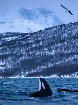Board the catamaran MS Gabriele to charge into whale pods, capturing orcas breaching and splashing with a telephoto lens (100% encounter rate in winter!)