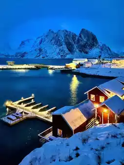 📌 Lofoten: Reine fishing village red cabins + snowy mountain background aurora
