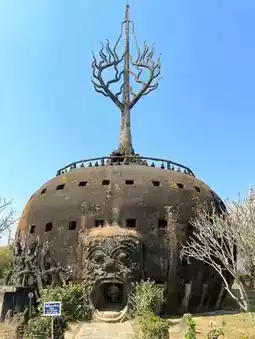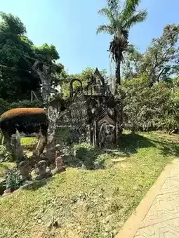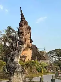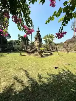 is a popular tourist attraction built in 1958, approximately 25 kilometres from the Vientiane city centre, and 7.3 kilometres from the Laos - Thai Friendshi Bridge. Inside, there are more than 200 sculptures, such as Buddha states, Vishnu, Shiva, and statues, showing the realms (hell-earth-heaven). The highlight is the pumpkin shaped statue with a mouth shaped door, which allows you to walk inside to take pictures and walk to the top step, where you can see the entire. It is a place where tourists often come to learn about history and culture through art and religious teaching in a quiet, shady, and beautiful atmosphere.