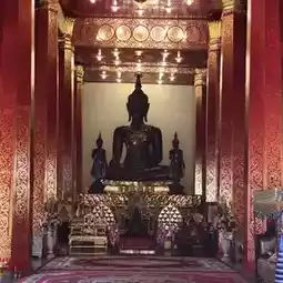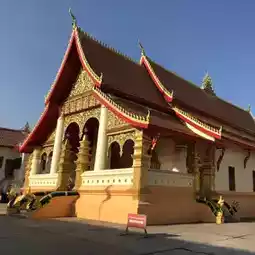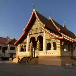 The temple stands out with its traditional Lan Xang architecture, featuring multi-tiered roofs adorned with intricate golden patterns and vibrant colors. As you step into the temple grounds, you'll be greeted by a large Buddha statue and a towering stupa, exuding a sense of tranquility and sacredness. Every corner offers picturesque views, whether it's the stupa against a blue sky or shaded pathways that evoke a nostalgic feeling of old Laos.