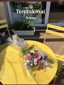 Tondokmai is decorated in a warm, minimalist style with a touch of European elegance. The crisp white walls and wooden shelves are lined with colorful potted flowers, including roses, hydrangeas, chamomile, and sunflowers. The atmosphere is peaceful yet lively, reflecting the natural essence.