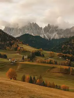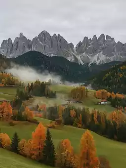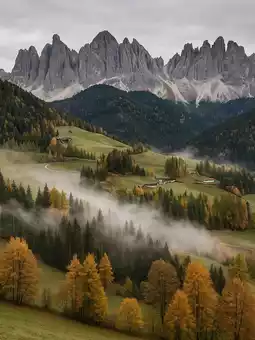 In Val di Funes, autumn feels alive — fog rises from the valley like smoke while the trees above burn in gold. The sharp peaks of the Odle Group appear and vanish between clouds, creating a rhythm of silence and awe. The ground is damp, covered in copper leaves, and the air carries the faint sweetness of wood smoke from distant cabins. I stayed still for a long time, watching how the landscape shifted every few minutes. The contrast of stone, mist, and color turns this place into something between a dream and a memory.
