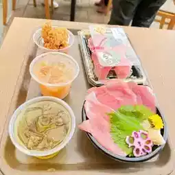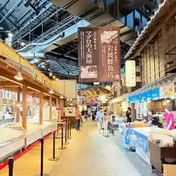 The aroma of the sea fills the air as soon as you enter Kuroshio Market, located near Wakayama Port. The main attraction is the daily tuna butchering show, where the chef's skillful knifework is a sight to behold. You can also sample the freshest sashimi right away! The market boasts a dazzling array of seafood bowls, grilled scallops, takoyaki, and other dishes, making for a truly satisfying experience. The second-floor terrace offers panoramic views of the harbor, where the sunlight shimmers on the water, inviting you to spend an entire afternoon. This isn't just a great place to enjoy seafood; it's a must-see spot to experience the vibrant energy of Wakayama Port.