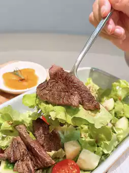 If you want to eat healthy, you can choose this salad. The steak is crispy on the outside and tender on the inside. It has a very fragrant beef flavor. It goes well with crispy salad vegetables. It's healthy to eat without burden