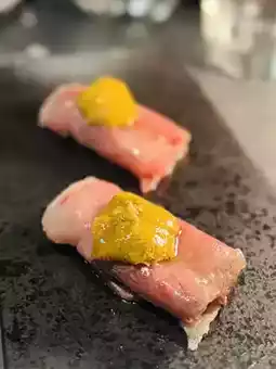 A surf and turf delight—wagyu slices rolled with sea urchin on top. The fresh, creamy uni combined with the buttery wagyu is a delightful surprise✨.