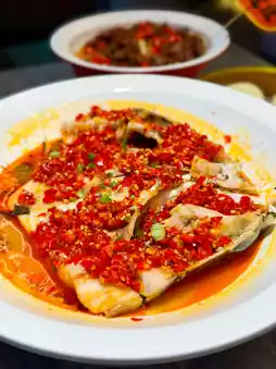 A fish head bigger than a basin paired with homemade chopped chili, forming a little volcano 🌶️ The fish eye’s gelatin sticks to your lips, the cheek is as smooth as tofu, and the sour and spicy broth soaks into the silver thread rolls. It’s unbelievably delicious!