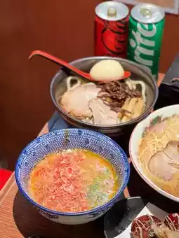 Tonkotsu broth mixed with sakura shrimp oil, topped with plenty of crispy sakura shrimp, releasing a strong fresh aroma. It also includes chashu, spicy wood ear mushrooms, bamboo shoots, and a soft-boiled egg. The thick noodles are chewier and more textured.