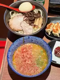 Rich and smooth tonkotsu broth enhanced with beef juice for a special savory collagen flavor. The translucent beef tendon is full of collagen and elastic texture. The thick chashu has a perfect balance of fat and lean meat, tender and flavorful without being greasy. A whole silky soft-boiled egg oozes sweet yolk, accompanied by spicy wood ear mushrooms and bamboo shoots. The thin noodles are chewy and hold the broth well.