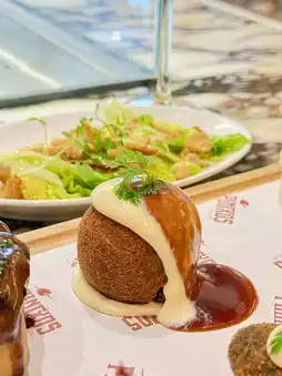 The potato beef rib bomb is crispy on the outside and soft on the inside, full of meat flavour, and complements the fluffy mashed potatoes.