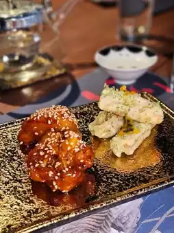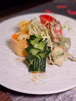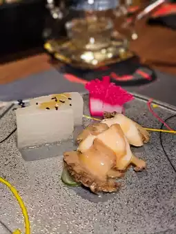 The simmered abalone is tender and well-seasoned, while the fried dishes surprise with lotus root tempura and sweet-and-sour cauliflower karaage. The latter resembles sweet-and-sour pork but offers a lighter, vegetable-based twist.