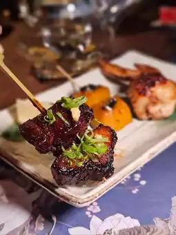 Charcoal-grilled items are particularly enticing, with highlights including salt-grilled chicken wing stuffed with fish maw and Japanese braised pork belly. The sea bass baked with sea urchin cream sauce is tender and smooth.