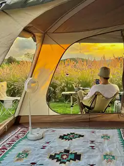 #Rainy season travel destinations, like-a-ka-ka, Wang Nam Khiao Camp & Cafe is a tent site that feels great. It's like being surrounded by green nature. The field is wide, airy, and has a beautiful hill view. The atmosphere is great. In the evening, the sunset view is beautiful. There is electricity and clean bathrooms. It is a tent site that is not far from Bangkok. It is another tent site that I really want to go back to. 💚🫶🏻