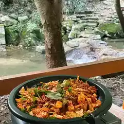 I visited Wooridongne Mountain Lodge in Wanju County. The duck stew was truly delicious, enjoyed while sitting on a wooden bench, listening to the cool sound of the stream. The moist duck stew was enhanced by the cheese sauce, and the fried rice served as a final touch was incredibly satisfying.